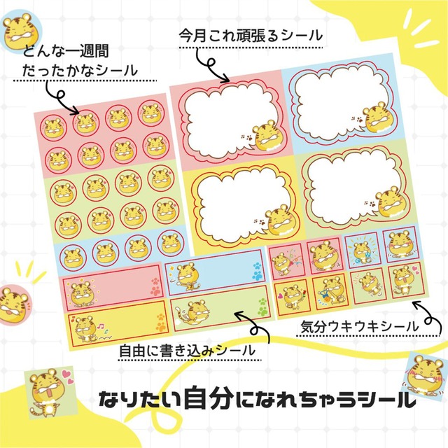 トラツバちゃんが あなたの1年を応援しちゃう! シールをペタペタ貼って 目標を達成しちゃおう! ーーーーーーーーーーーーー ご要望の嵐だった 「トラツバちゃんシール」ついに登場 もちろん! ただのかわいいシールではございません トラツバちゃんがあなたの夢を応援! 「なりたい自分になれちゃうシール」 ************ 【秘密その1】 「今月これ頑張るシール」 毎月の目標を書き込める吹き出しシールが 12枚=1年分ついてきます! ************ 【秘密その2】 「どんな一週間だったかなシール」 週に一度振り返ってみよう! 「めっちゃ良い」「とっても良い」「良い」 「良い」を見つけて 自分に〇をつける練習になるよ! 60枚=1年分ついてきます! ************ 【秘密その3】 「自由に使える書き込みシール」×12 「気分ウキウキシール」×24 手帳に!お手紙に! いろんなところに貼ってみて♪ ホッコリ♡ウキウキ♡キュンキュン♡ シールで気分を盛り上げよう! ************ あなたは2024年をどんな年にしますか? トラツバちゃんと一緒に なりたい自分になってみませんか? ーーーーーーーーーーーーー ・寸法 ・シート1枚 178㎜×123mm ・どんな一週間だったかなシール 12×12(mm) ・気分ウキウキシール 15×15(mm) ・自由に使える書き込みシール 44×15(mm) ・今月これ頑張るシール 48×35(mm) ・シールは同じシート×3枚で 1パッケージとなっております ・画像イラストの赤い線が シールのカットラインとなります ・ポスト投函サービスにてお届けします ◆年末年始のご案内◆ 12月29日までのご注文は年内に発送手続きをいたします (年内到着をお約束するものではありません) 12月30日~1月7日までのご注文に関しては 1月8日以降に発送手続きをいたします