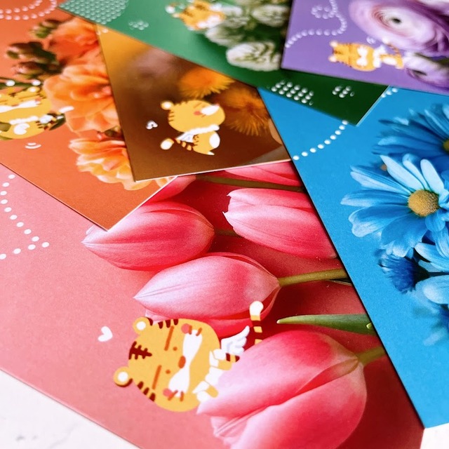 トラツバちゃんグッズに 待望のポストカードセットが登場! 初めてのAIアートとのコラボです 「幸せ」の意味を持つ 6種類のお花とトラツバちゃん 自分で持っていても 誰かにプレゼントしても みんなみんな 「幸せ」になれちゃう! 宛名面もとってもかわいい デザインになっています 「チューリップ」 「カランコエ」 「タンポポ」 「クローバー」 「ブルーデイジー」 「ラナンキュラス」 ーーーーーーーー 私製はがき サイズ:100mm×148mm 所定の切手を貼ってご使用ください ーーーーーーーー ・ポスト投函サービスにてお届けします